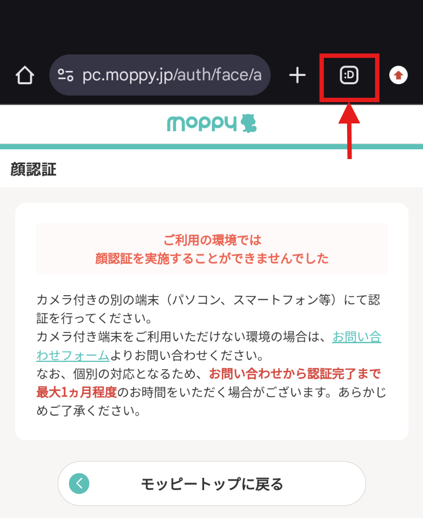 カメラ機能付きの別の端末(パソコン、スマートフォン等)をお持ちの場合は、そちらでモッピーにログインし、顔認証を実施してください。
