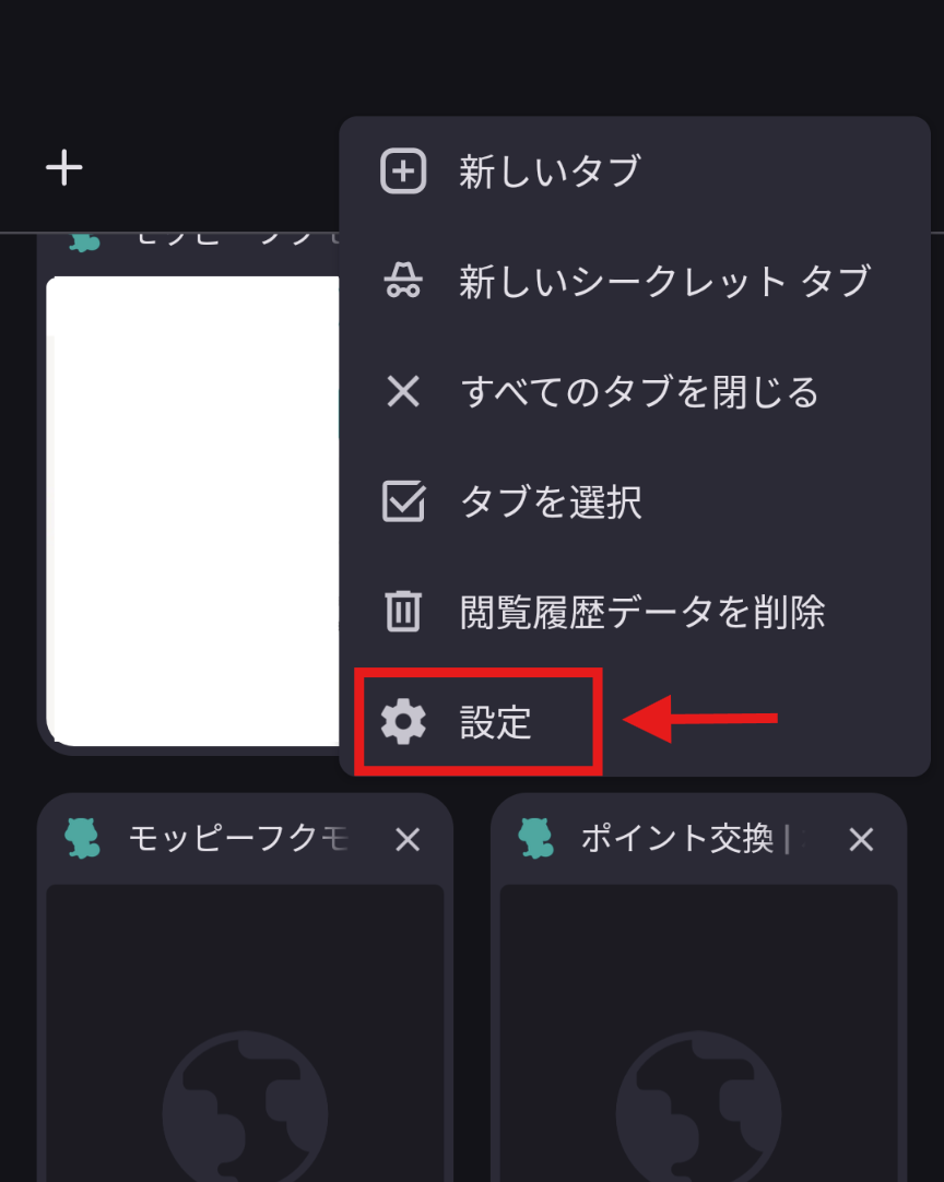 2.右上の三点メニューより、【設定】を選択