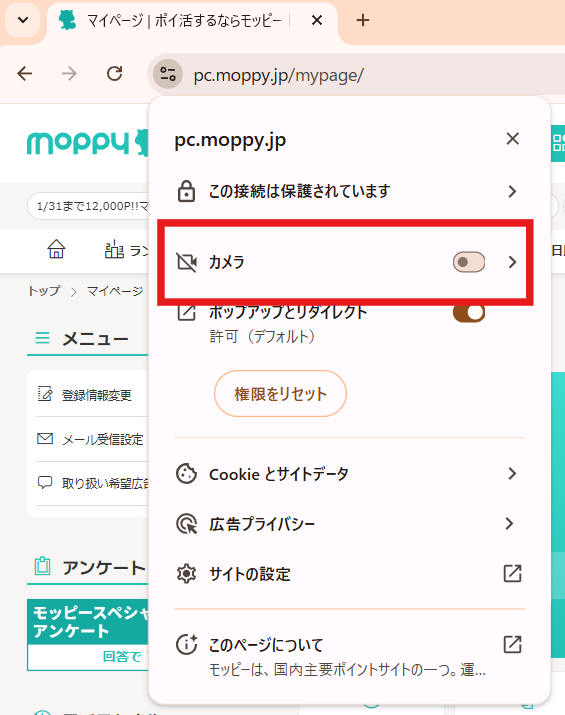 設定 → プライバシー → 権限マネージャー → カメラ→モッピーを開いているブラウアプリを選択